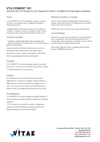 VTA CEMENT 101 çimento katkıları, çimento endüstrisi Ürün 5 °C’nin üstünde depolanmalıdır. Ürünün donması